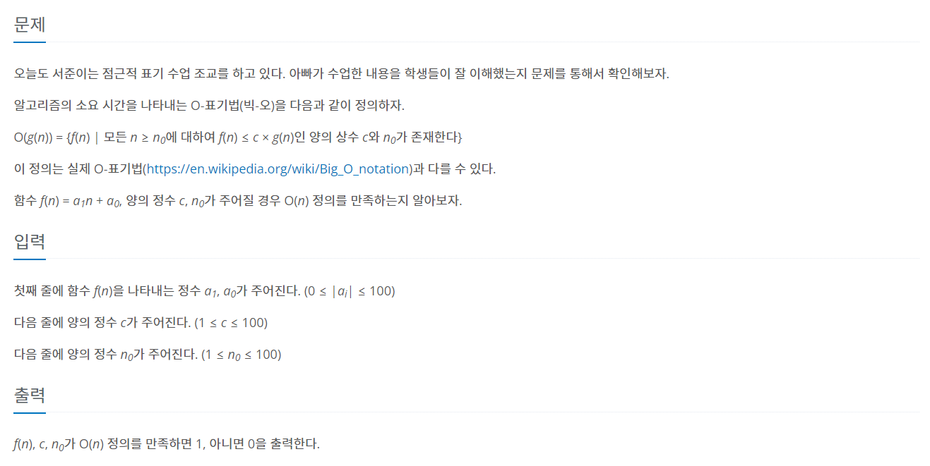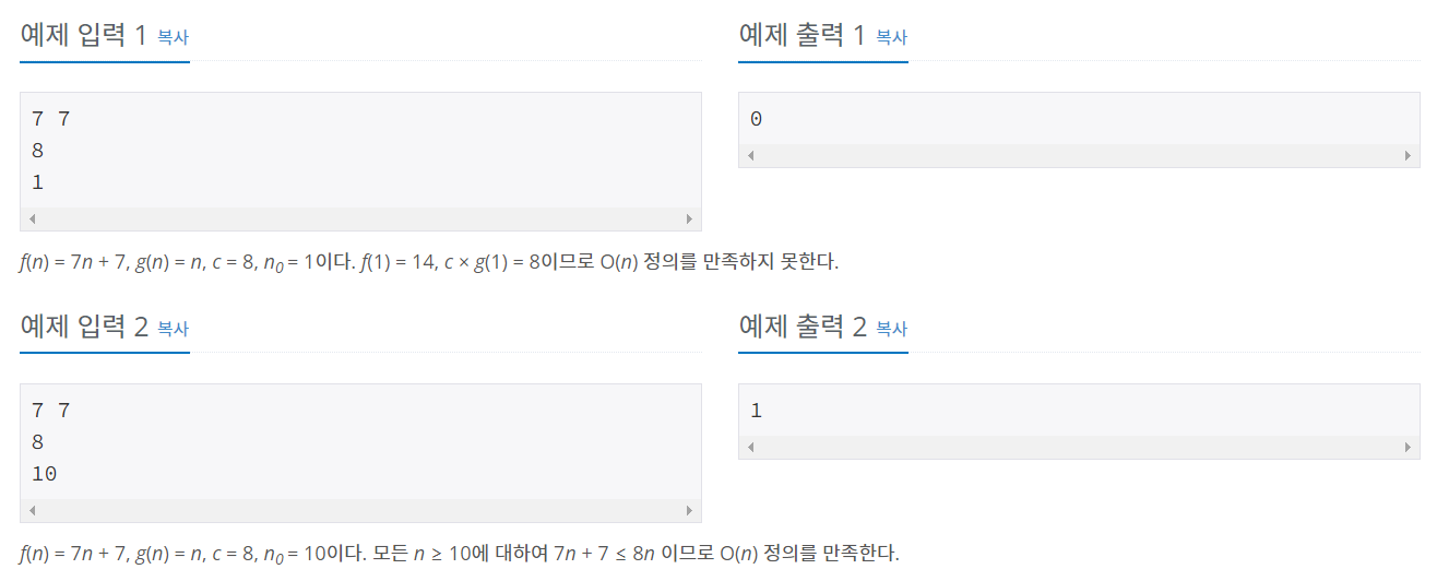 if문으로 a1 * n + a0 의 값이 c * n 의 값보다 작거나 같고, a1 이 c 보다 작거나 같다면 1을 출력한다.