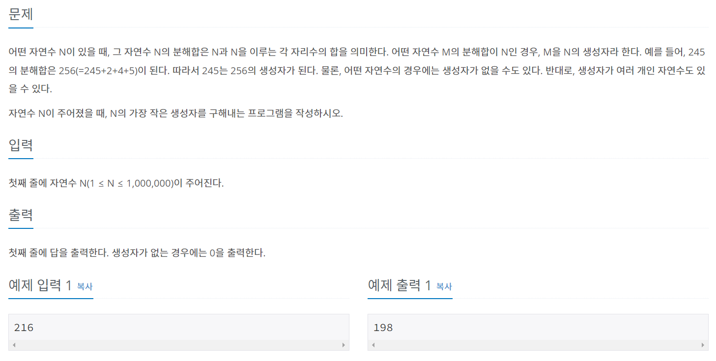 이를 위해 1부터 N 까지의 수들을 확인하며 그 수와 각 자릿수를 더한 값이 N이 되는 첫 번째 경우 그 수를 출력하자.