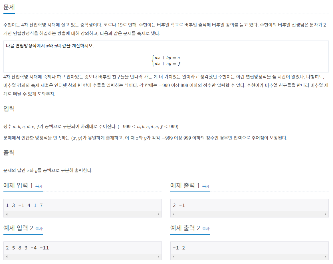 이중 for문으로 x 와 y 가 -999 ~ 999인 모든 경우를 확인하며 식이 성립될 때까지 반복하자.