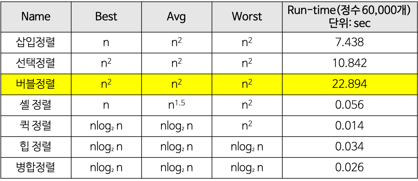다른 정렬의 시간복잡도와 비교해보면 꽤 비효율적이라는 것을 볼 수 있다.