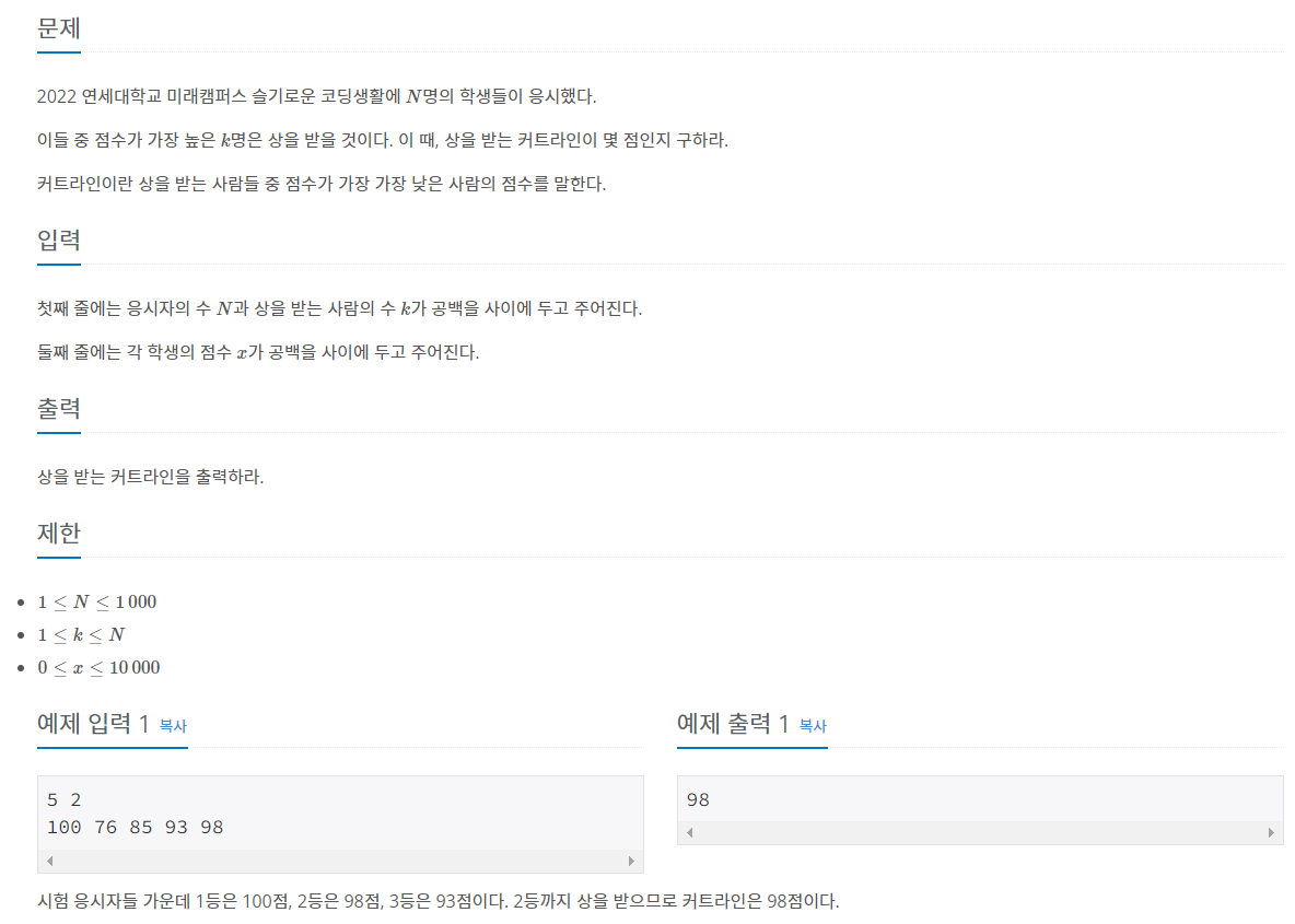 cin 으로 정수(점수 개수, 수상자 수)를 입력받아 각각 n, k 에 저장.