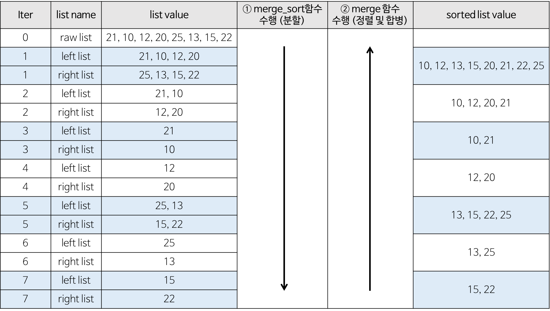 /* 위에서 실행 한 merge_sort 함수를 순환 호출 하였기 때문에 배열이 제일 작은 부분 배열까지