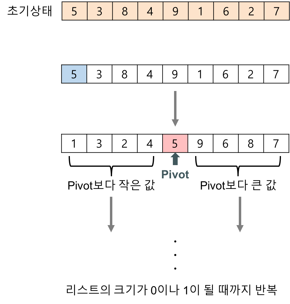 피벗을 기준으로 피벗보다 작은 값은 왼쪽, 큰 값은 오른쪽으로 위치하도록 한다.