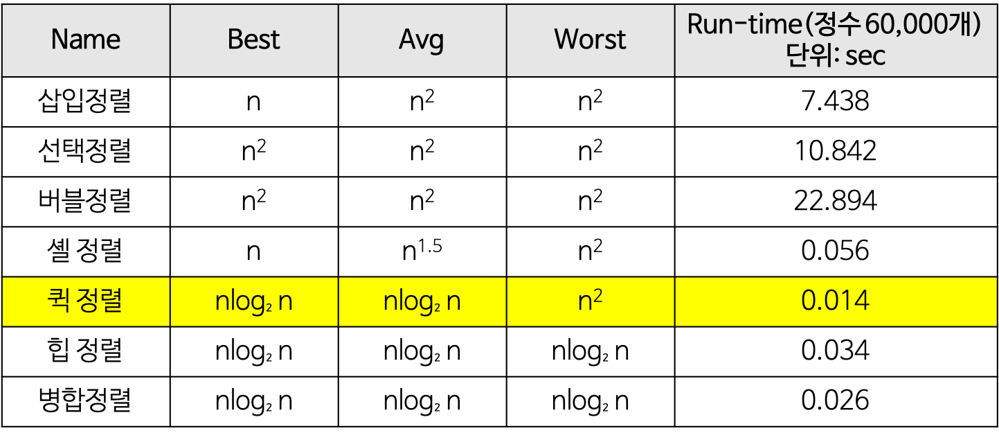 아래를 통해 다른 정렬 알고리즘과 시간복잡도를 비교해보자.