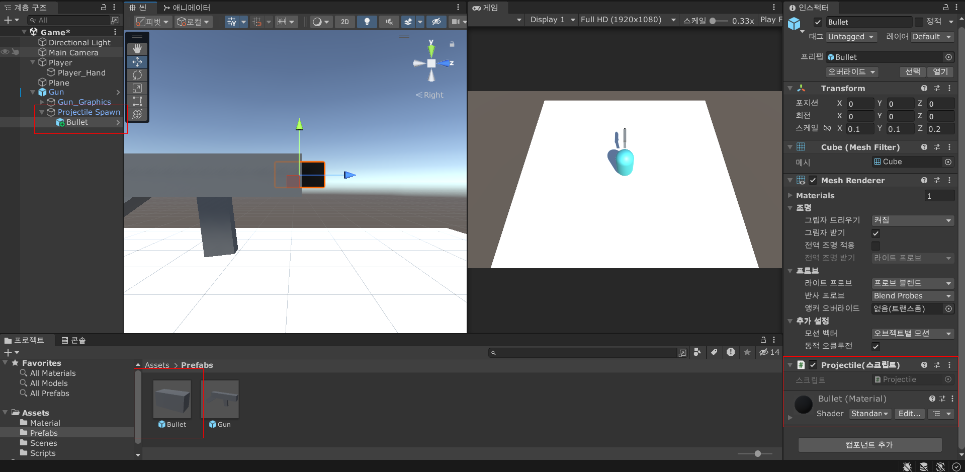 이제 그 하위에 Bullet 이라는 큐브 오브젝트를 생성하고 크기를 설정한다.