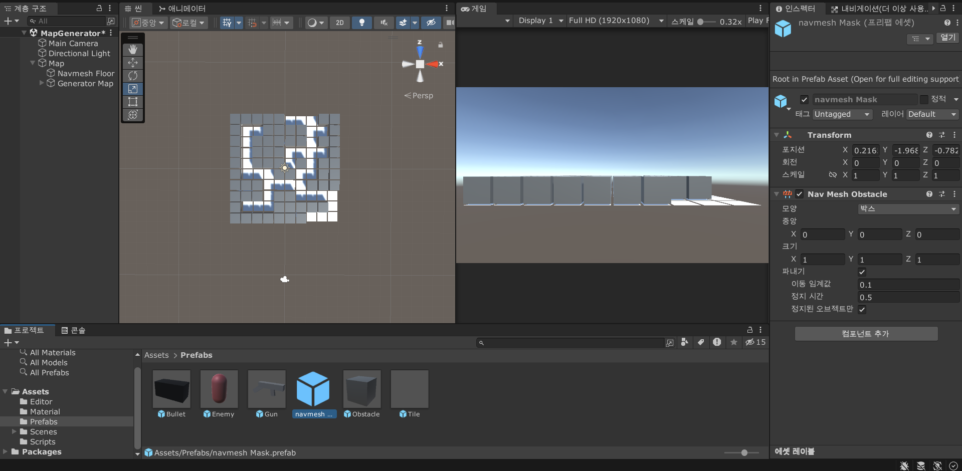 내브메쉬 맵과 타일 맵 사이, 상, 하, 좌, 우의 중간지점에 navmesh Mask 오브젝트를 위치해야 한다.