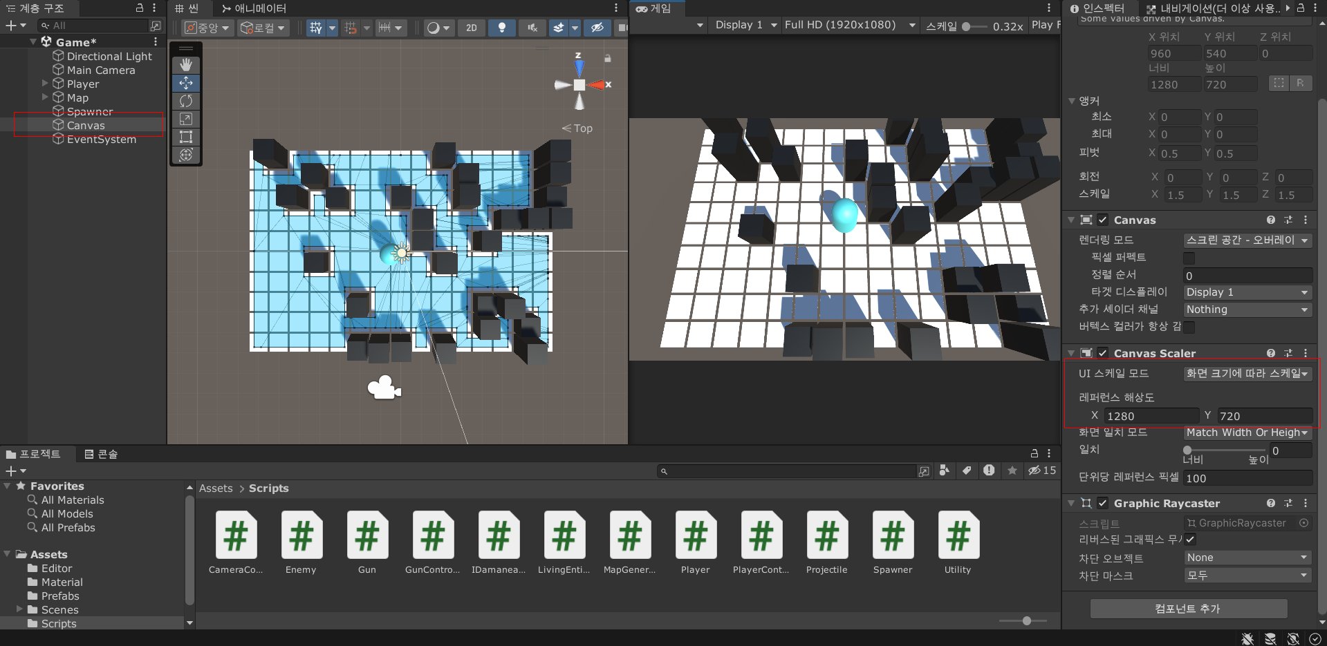 스케일 모드(사이즈를 자동으로 화면 비율에 맞추도록)와 해상도를 설정한다.