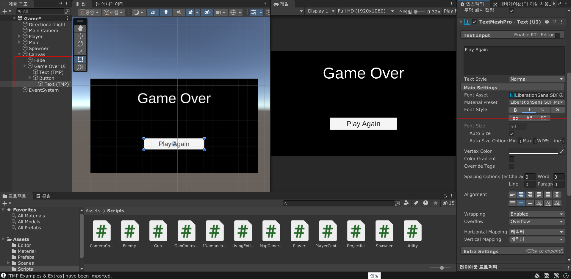 Game Over UI 라는 빈 오브젝트를 만들고 그 아래에