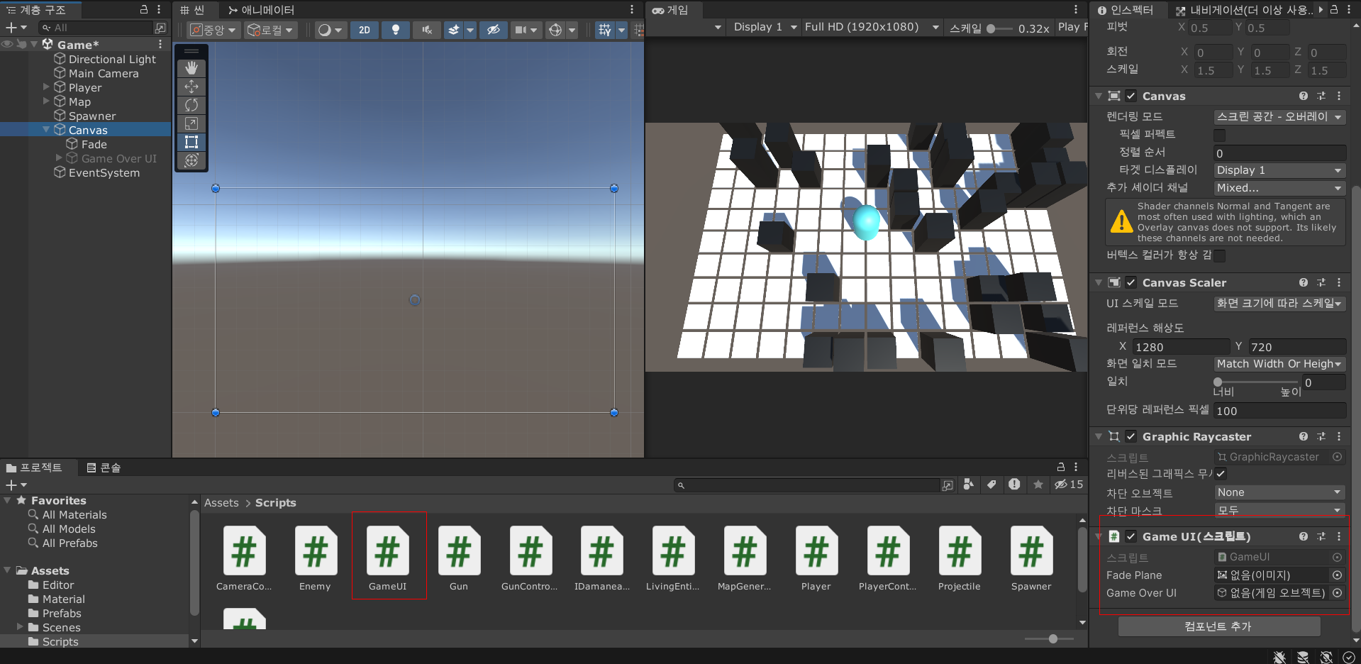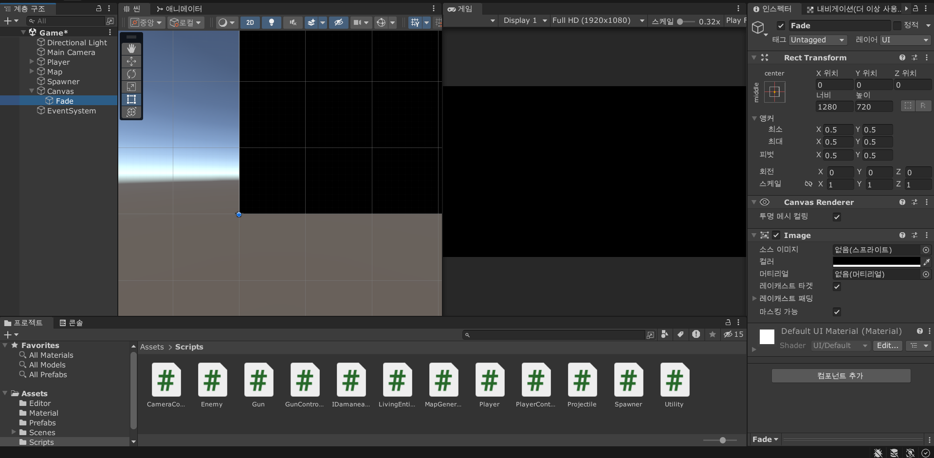 Fade Plane 는 Fade 오브젝트를, Game Over UI 는 Game Over UI 오브젝트를 할당해주고