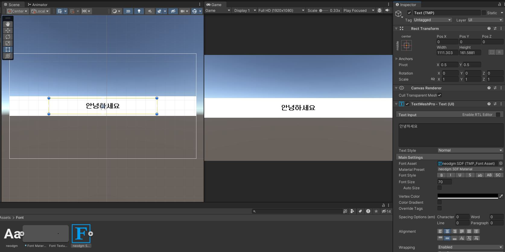 ?! 제작 중에 텍스트 메쉬 프로(TMP)에서 한글을 입력하자 게임 화면에서 깨져서 출력됐다.