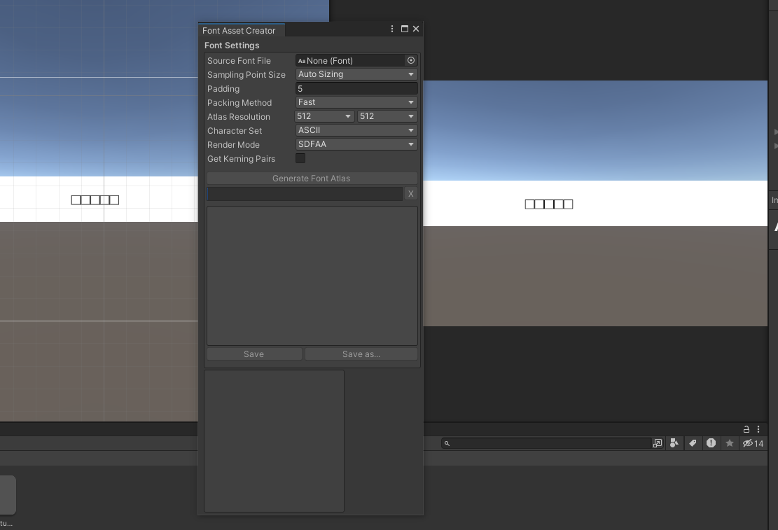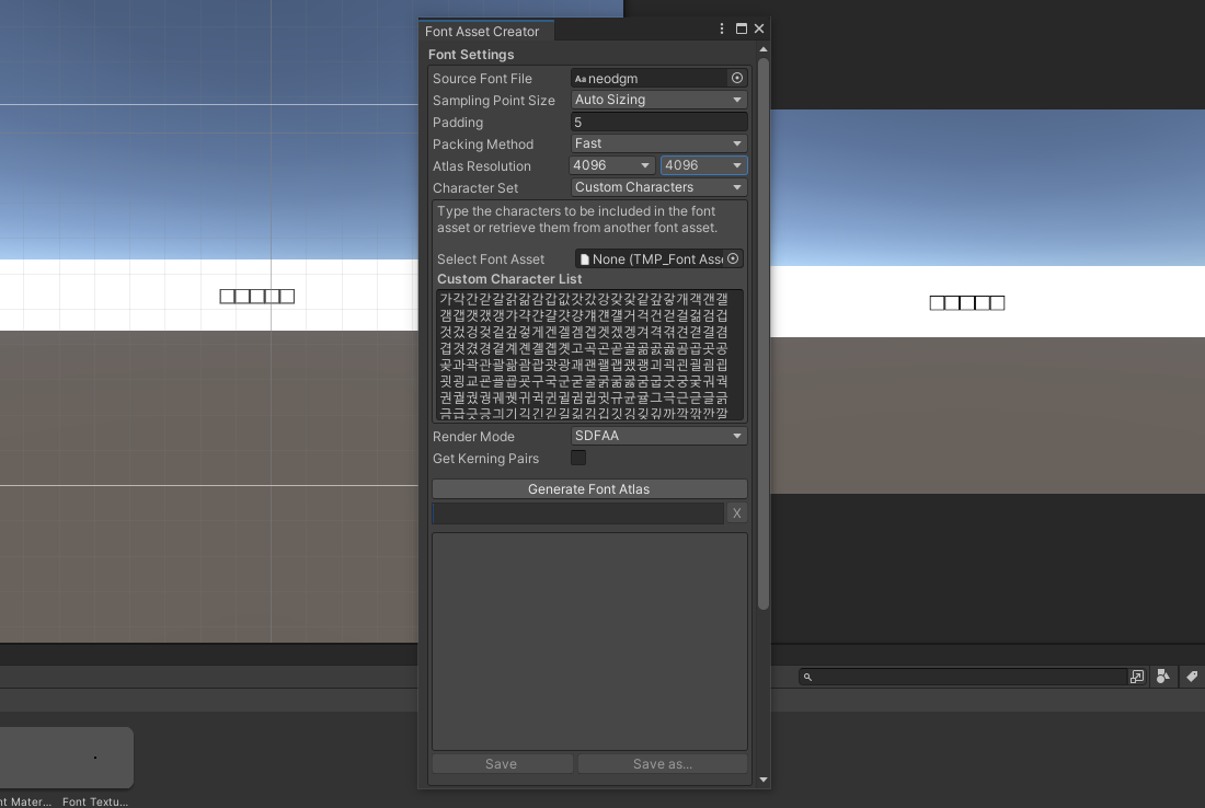 이와 같이 설정 후 Generate Font Atlas를 눌러 폰트를 변환하고 Save 를 눌러 저장하자.