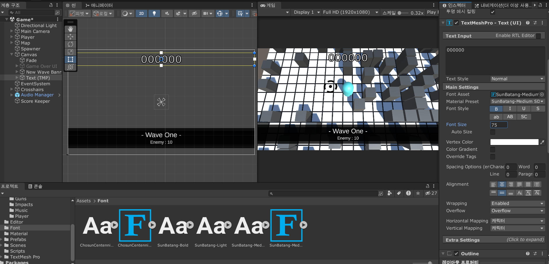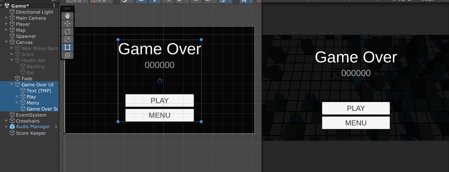 그리고 최종 점수를 출력하기 위해 Game Over Score 라는 TMP 오브젝트도 추가한다.
