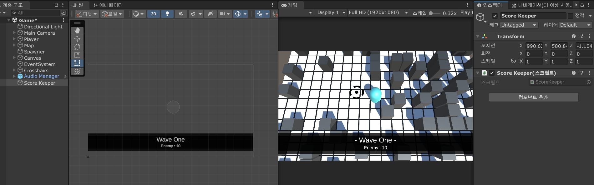 Game 씬으로 이동하여 Score Keeper 스크립트와 오브젝트를 만들어 적용하자.