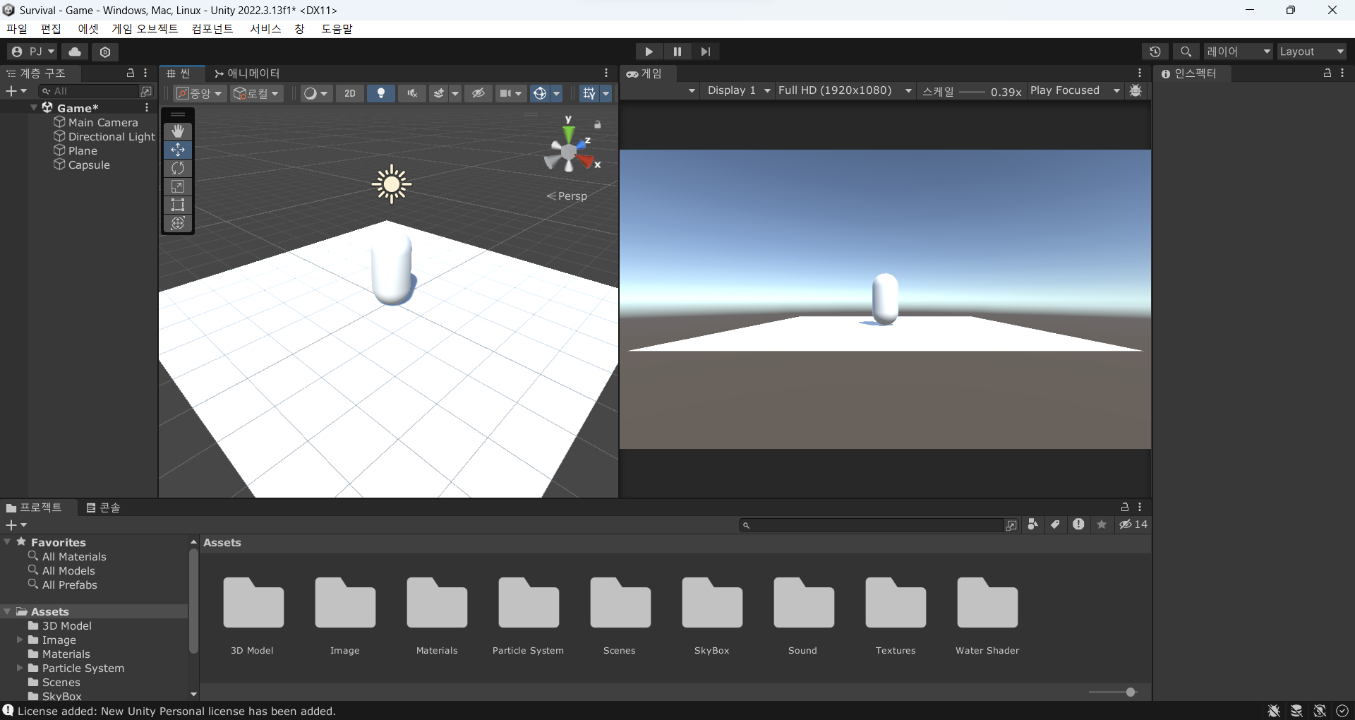 에셋들을 적용했다면 기본 큐브를 지우고, 바닥이 될 평면과 플레이어가 될 캡슐을 생성하자.