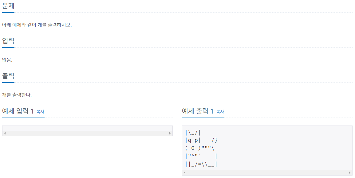 10171번 고양이 문제와 비슷하게 cout 을 통해 특수문자로 개를 출력한다.