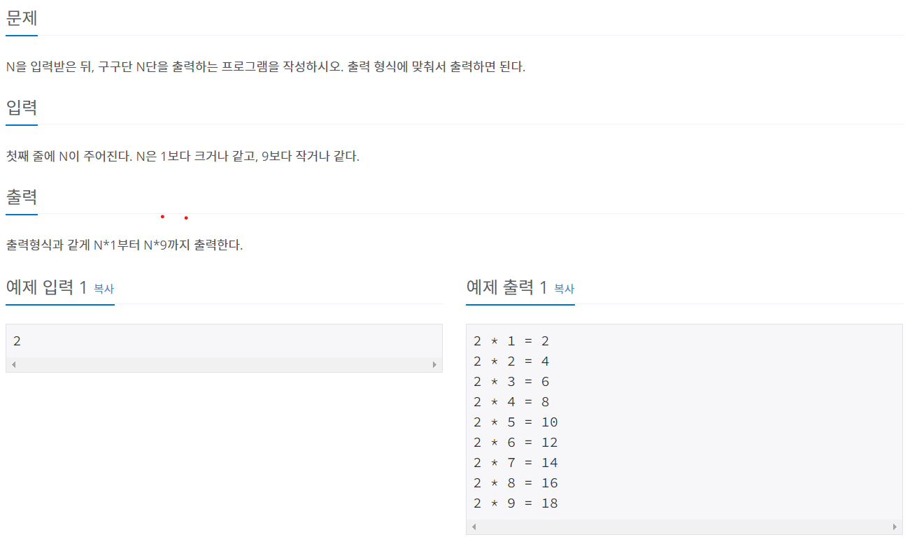 따라서 for문이 9번 반복되도록 하고, 1부터 9까지의 수를 입력받은 값에 곱하며 출력.