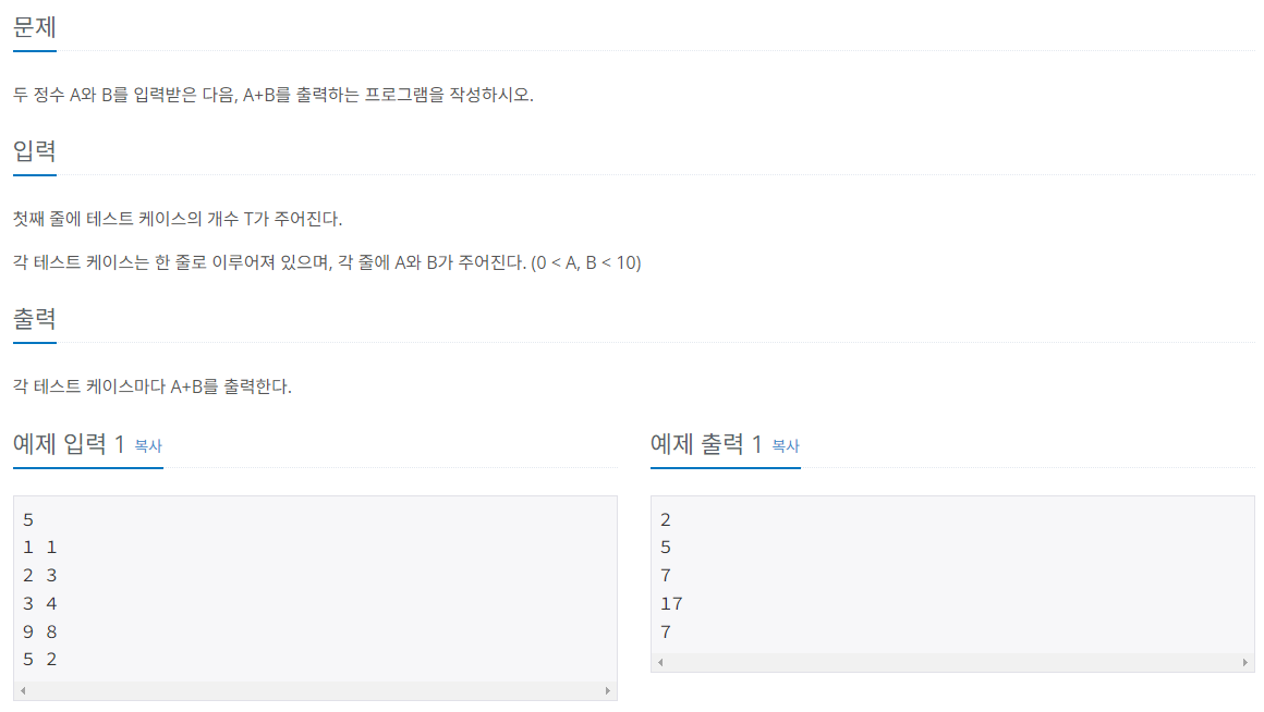 반복 마다 cin 으로 a와 b에 정수를 입력받아 저장. cout 으로 a와 b를 더한 값을 출력.