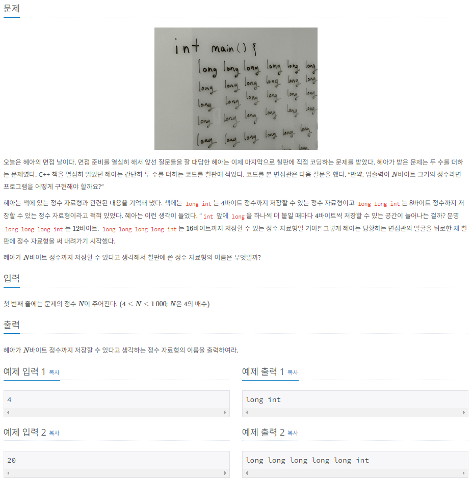 반복문을 통해 해당 횟수 만큼 long 을 출력하고 끝에 int 를 출력한다.
