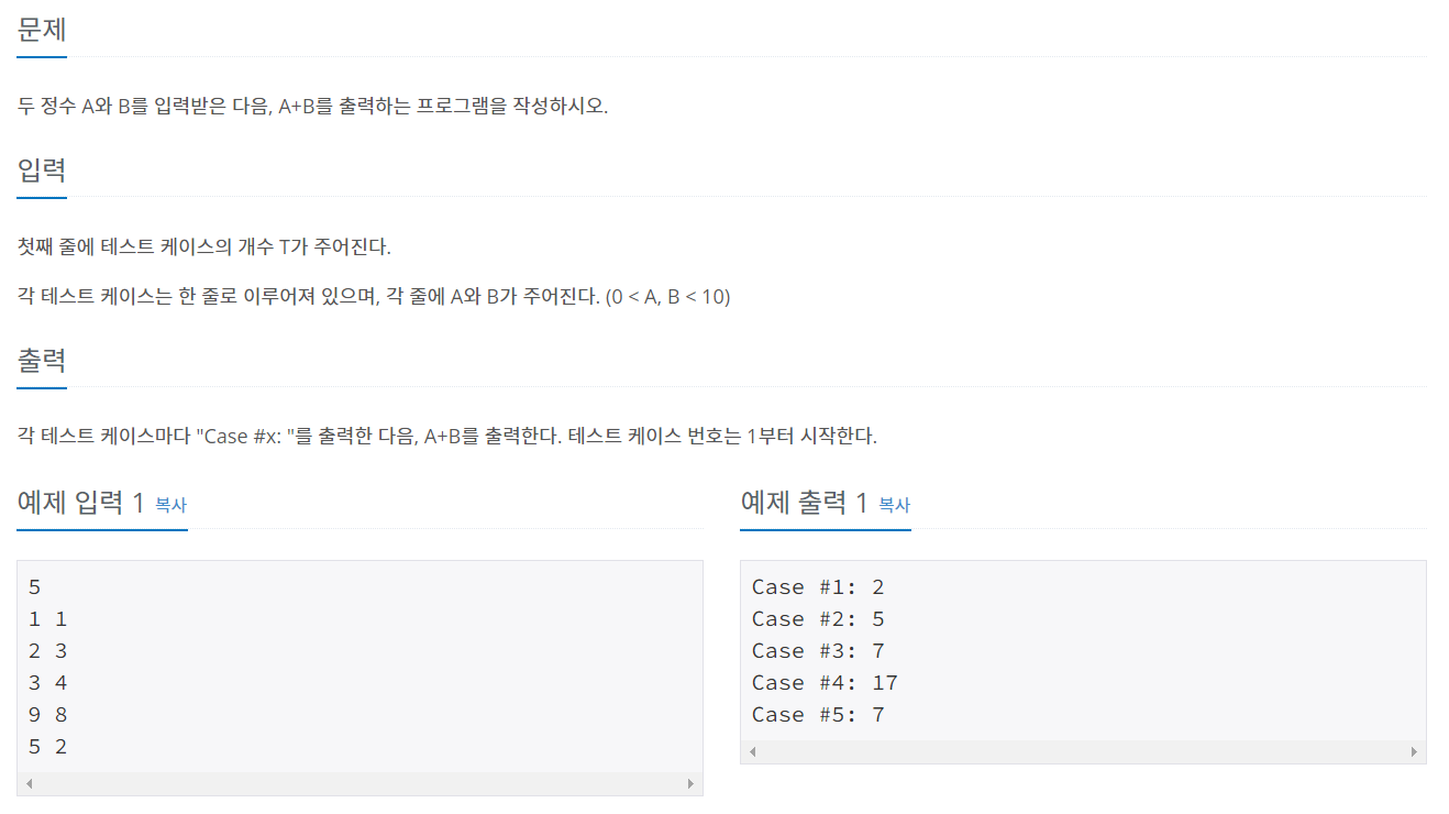 반복문 내부에서는 cin 으로 정수 두 개를 입력받고, cout 으로 Case #i: a+b값 형식으로 출력하도록 한다.