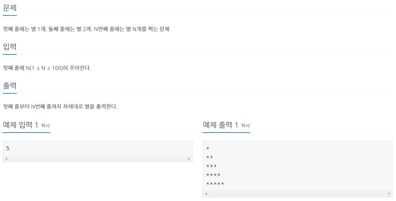 줄 수를 입력받고 반복문으로 줄 수 만큼, n번째 줄에 n개의 별이 출력되도록하자.