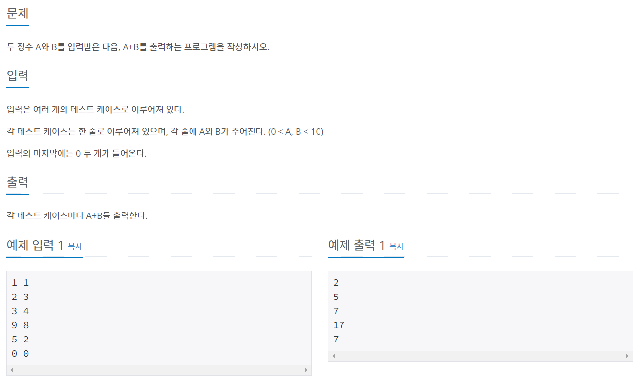 정수 두 개를 입력받아 그 합을 출력하는 문제이다. 문제는 입력받는 값이 둘 다 0이 될 때 까지