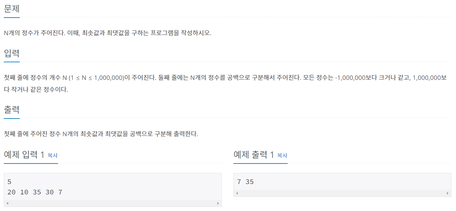 N개의 정수가 주어지고, 주어진 정수들 중에 최솟값과 최댓값을 찾아보자.