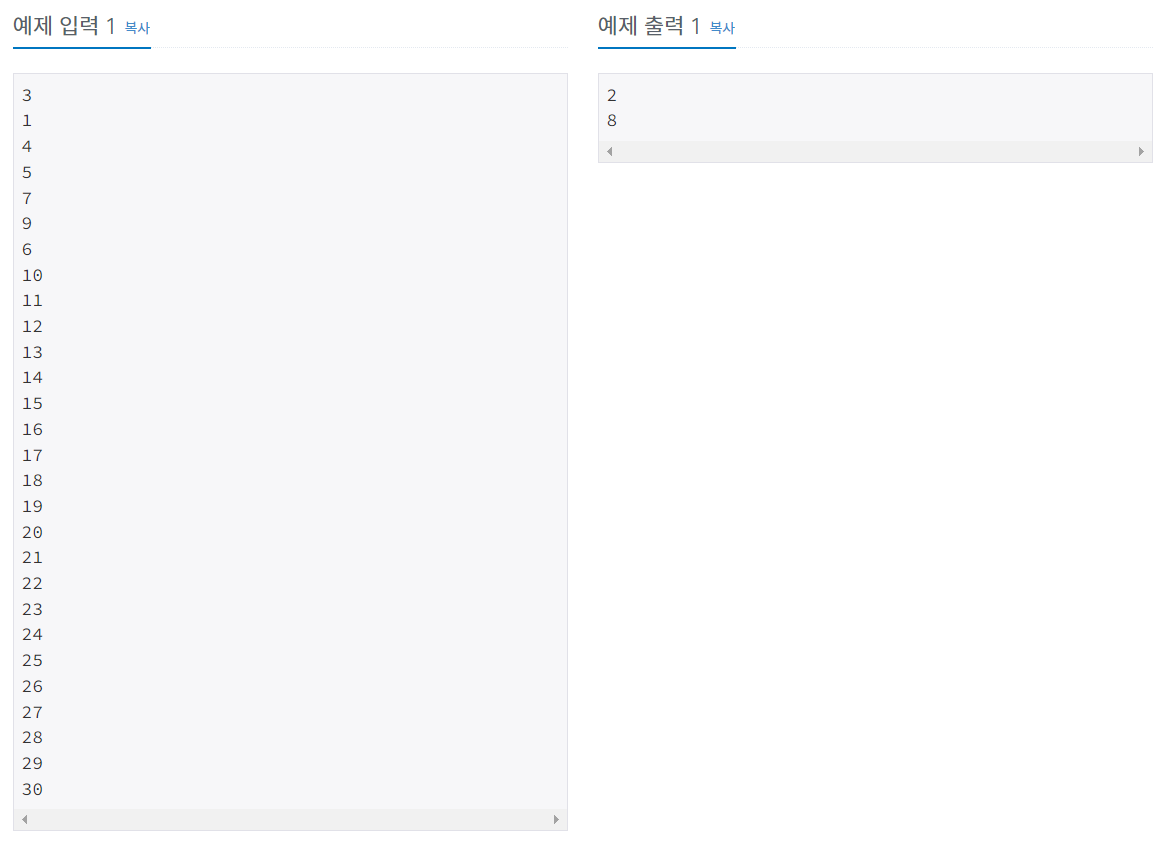 1~30까지의 수 중 28개만을 입력받고, 이 중 입력받지 않은 값을 찾아서 작은 순서대로 출력해야 한다.