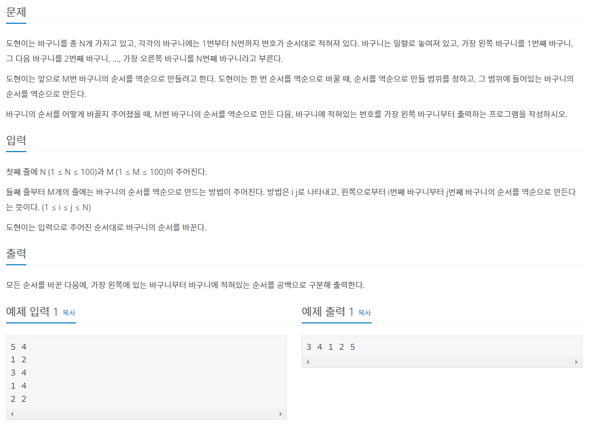cin 으로 바구니의 갯수와 바구니를 역순으로 바꾸는 횟수를 입력받아 n 과 m 에 저장한다.