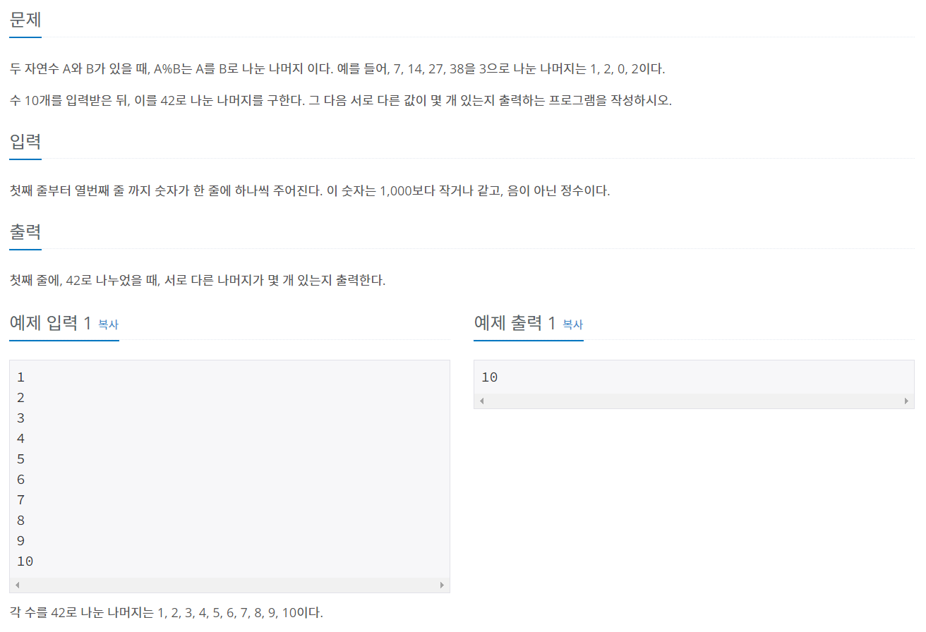 입력받은 10개의 정수를 42로 나누었을 때, 다른 나머지가 몇 개인지 출력하자.