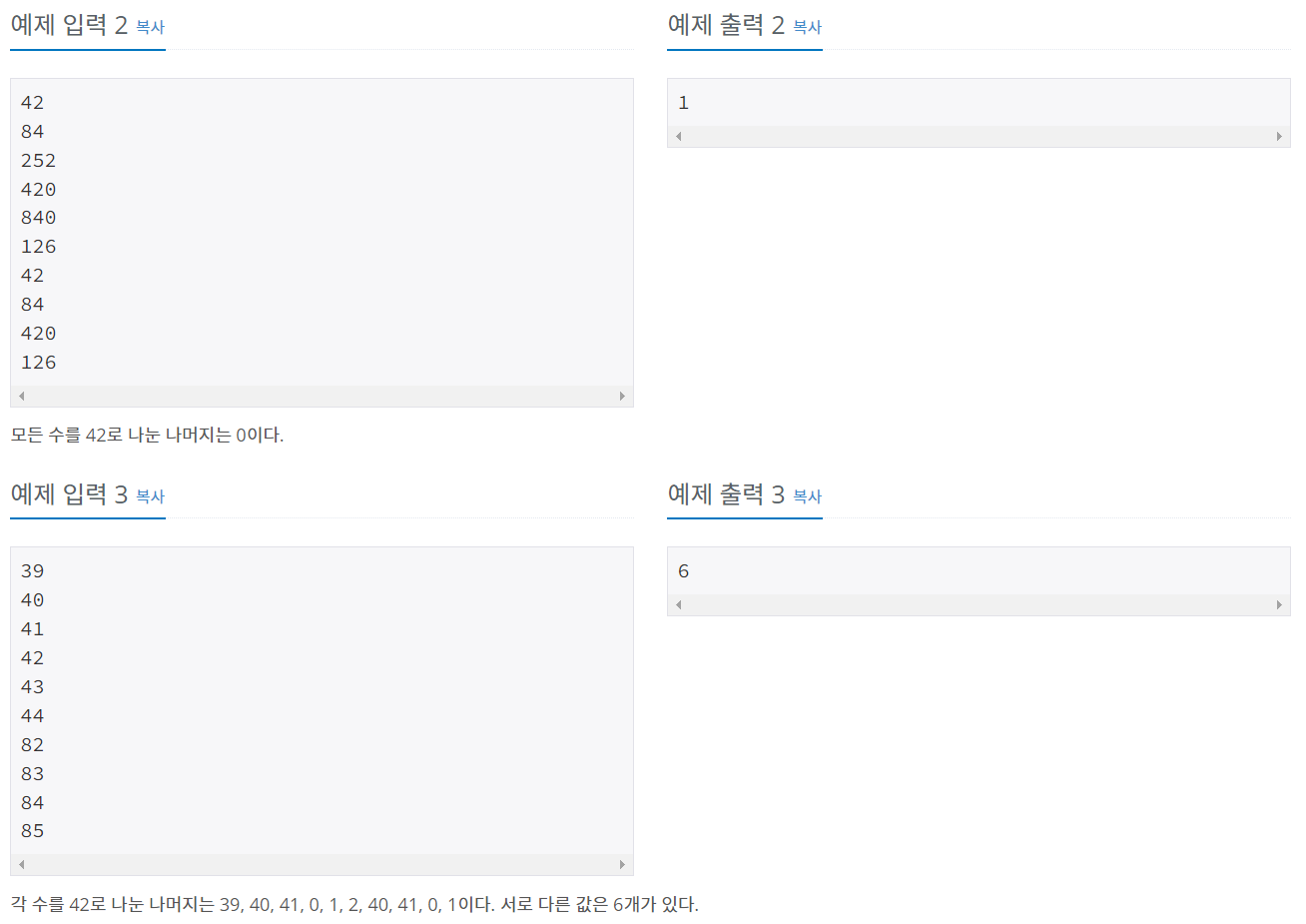 정수를 42로 나누었을 때 나올 수 있는 나머지는 0~41 까지 총 42개 이다.