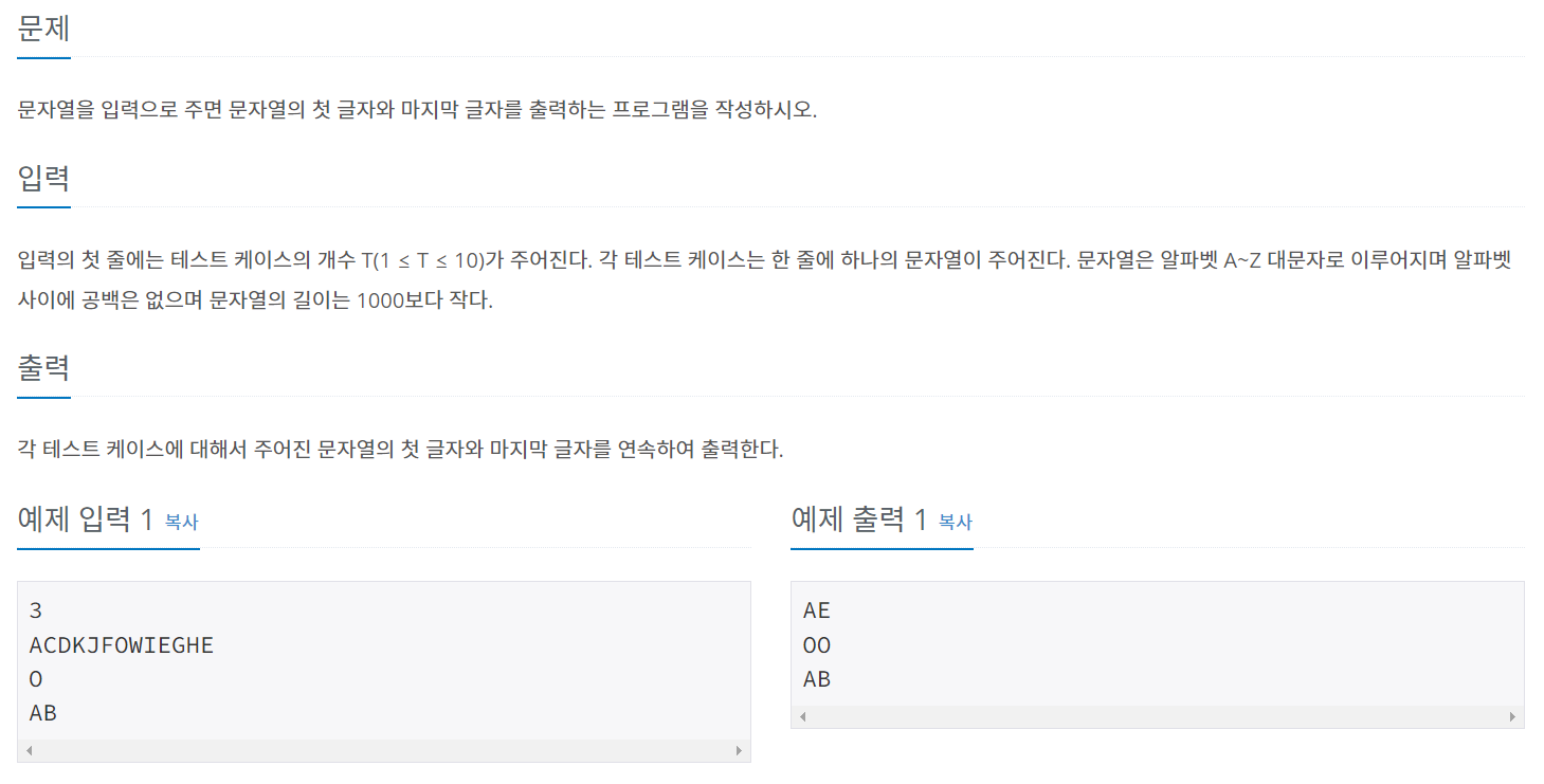 문자열을 지정한 개수만큼 입력받고, 입력받은 문자열들의 맨 앞과 뒤의 문자를 출력한다.