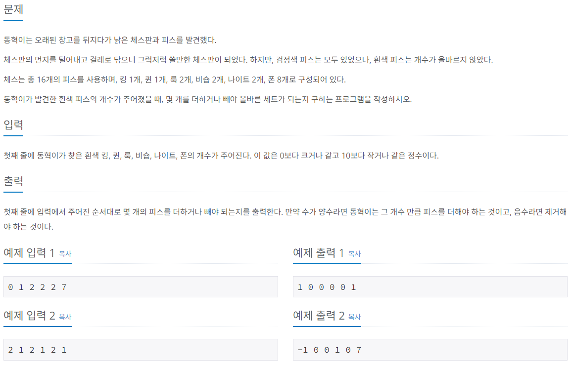 현재 보유한 체스 말 개수를 입력받고 몇개를 빼고 더해야 하는지 출력하자.
