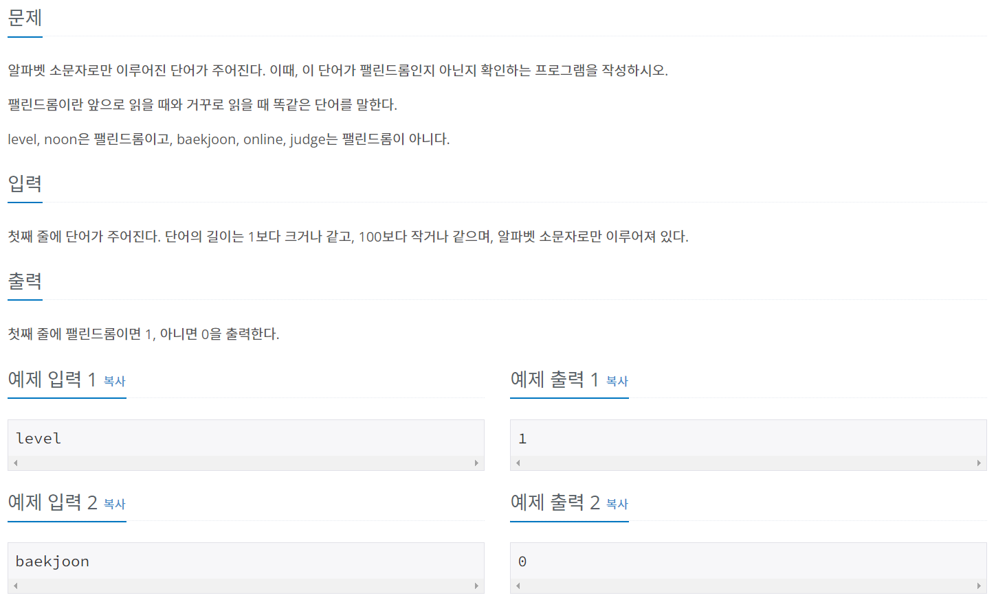 for문으로 i 는 0부터, j 는 s 의 길이에서 1을 뺀 값(마지막 문자 인덱스를 찾기 위해 문자의 길이 - 1)부터 시작하여i 가 j 보다 작거나 같을 때 i 에는 1씩 더하고, j 는 1씩 빼며 반복하도록 한다.반복문 내에서는 if문으로 s 의 i 번 인덱스의 값(i + 1번째 문자)와 j 번 인덱스의 값(j + 1번째 문자)가 다르다면0을 출력하고 프로그램을 종료한다.