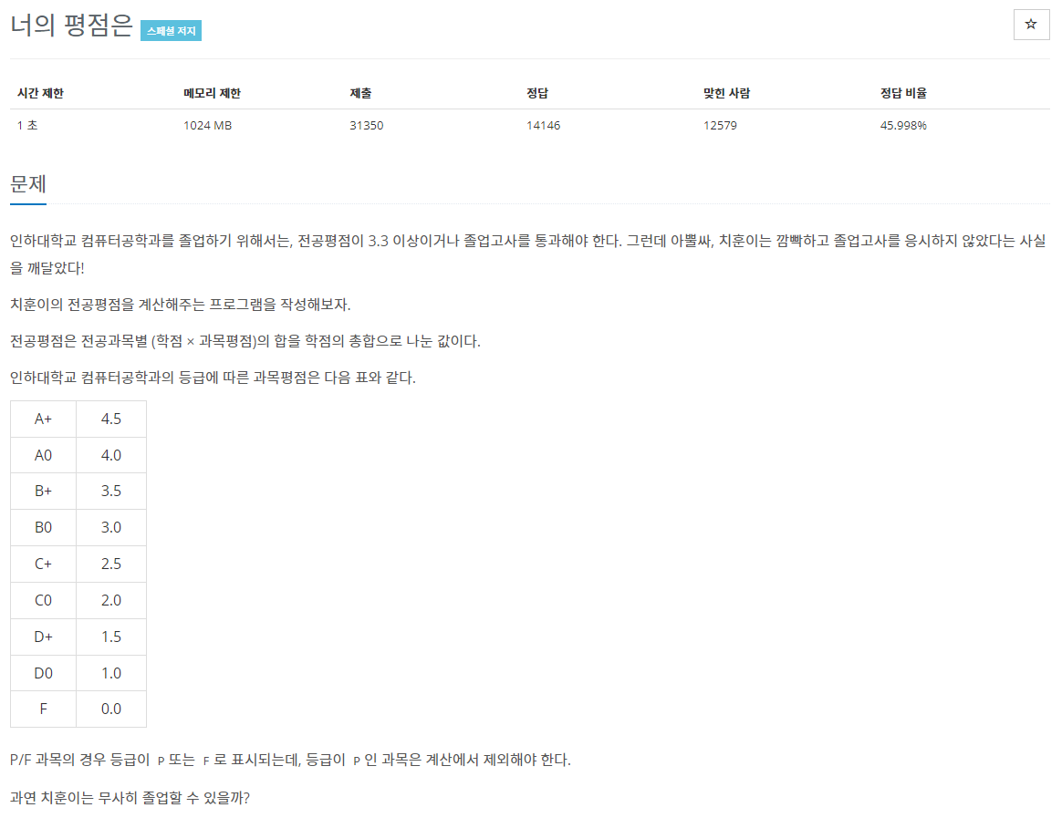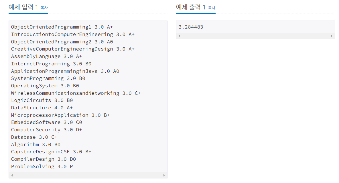 반복하며 학점을 입력받고 해당 과목이 P/F 과목이 아닌 경우 학점 X 과목 평점의 값을 현재 grade1 변수의 값에 더한다.