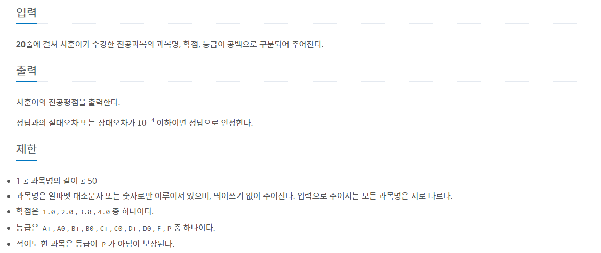 이렇게 반복이 끝나 20종류의 과목 학점을 모두 입력받고, 각 변수에 더했다면 grade1 변수의 값을 grade2 변수의 값으로 나누고, 그 값을 출력한다.