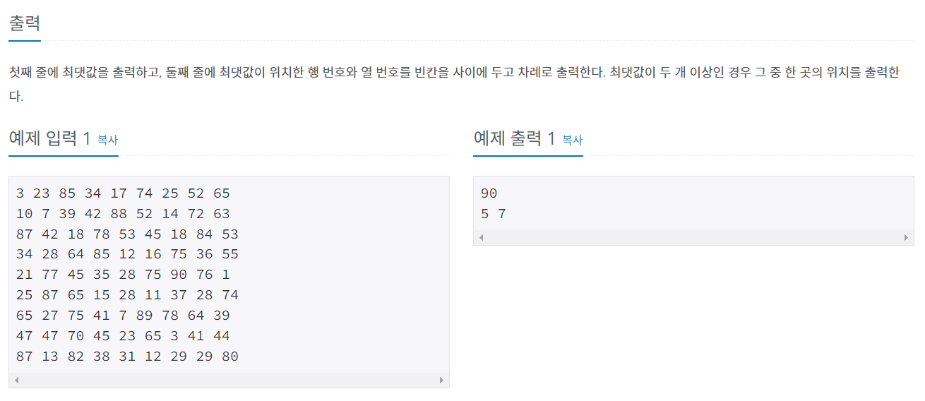 행렬을 돌며 값을 비교해 최대값 변수에 저장하고, 저장할 때 해당 배열의 인덱스를 저장하자.