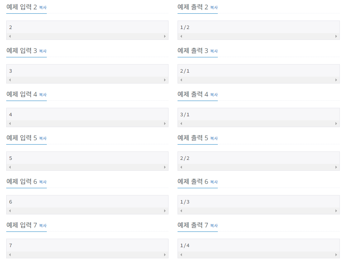 즉 짝수 i 번 대각선에서는 분자가 1부터 i 까지 증가, 홀수 i 번 대각선에서는 분모가 1부터 i 까지 증가 한다는 것이다.