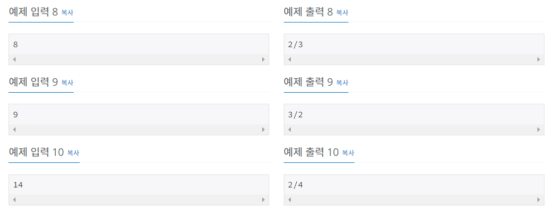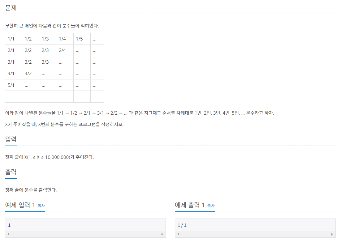대각선을 따라 지그재그 순서로 분수를 확인하여 해당 순서의 분수를 출력하는 것이 문제이다.