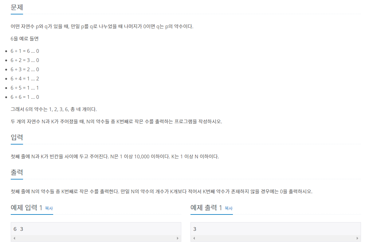 이렇게 약수를 구하며 카운트를 증가시키다가 입력받은 K 의 값과 같아지면 반복을 빠져나오고, 해당 수를 출력한다.