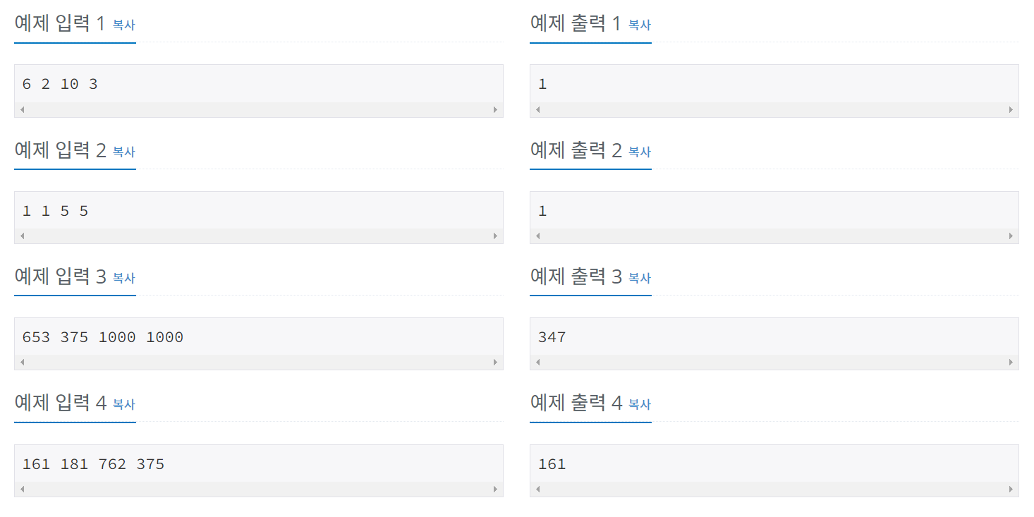 cin 으로 정수(좌표)를 입력받아 각각 a, b, w, h 에 저장한다.