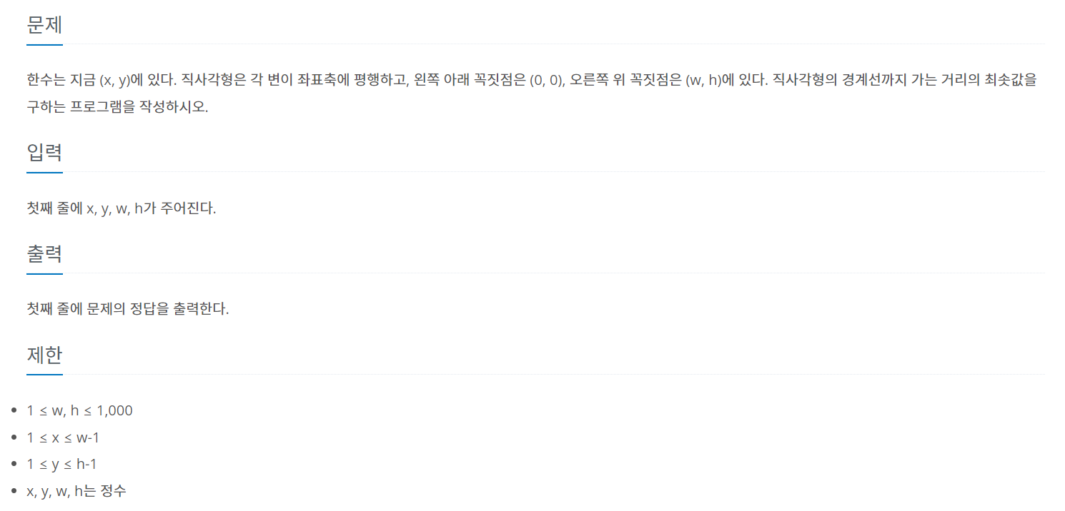 그리고 입력받은 w 에서 x 를 빼고, h 에서 y 를 빼준다, 뺸 값을 최소값과 비교하여 작을 경우 최소값에 저장하자.