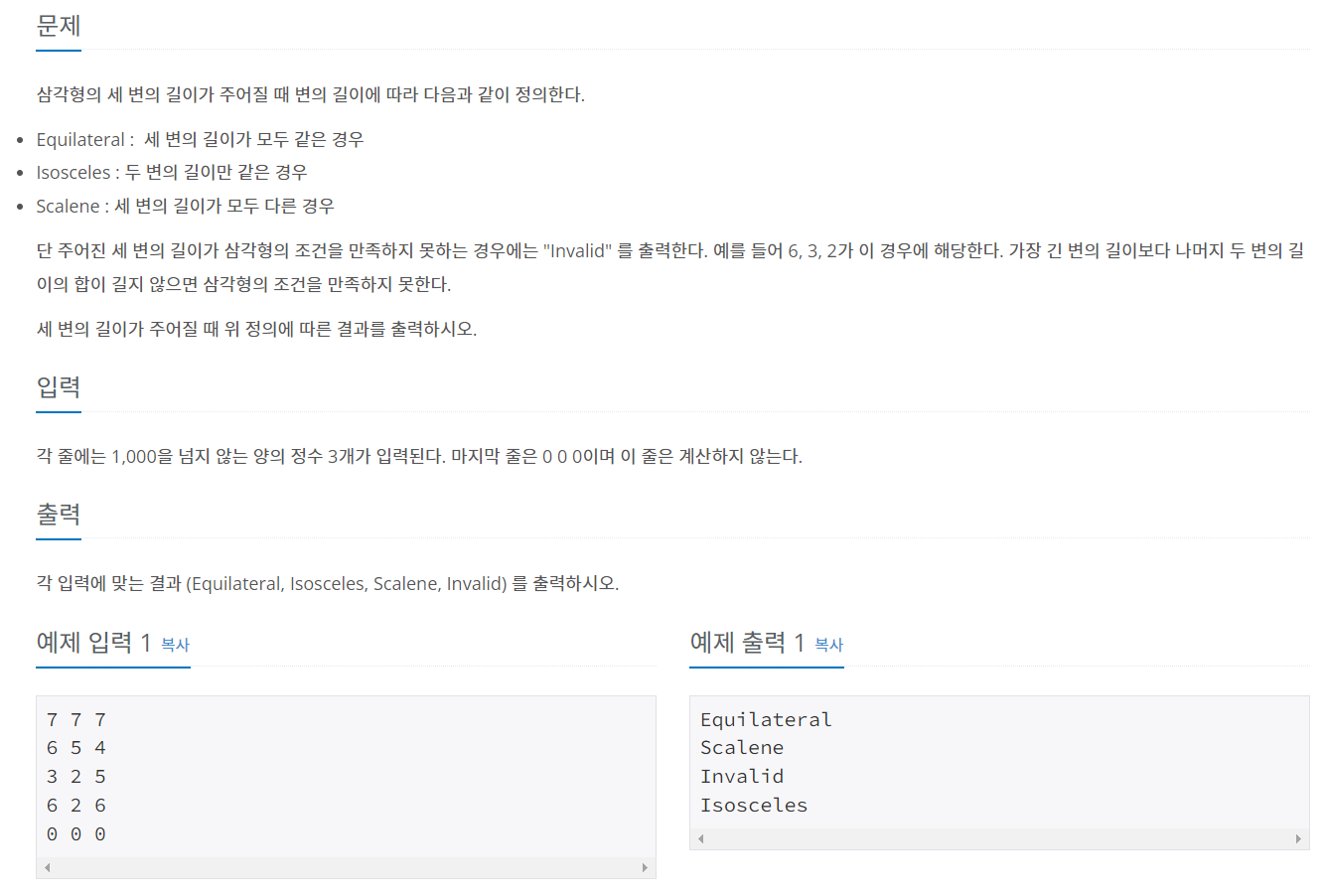 아니라면 같은 변이 있는지 확인하여 맞다면 Isosceles 를, 없다면 Scalene 을 출력하자.