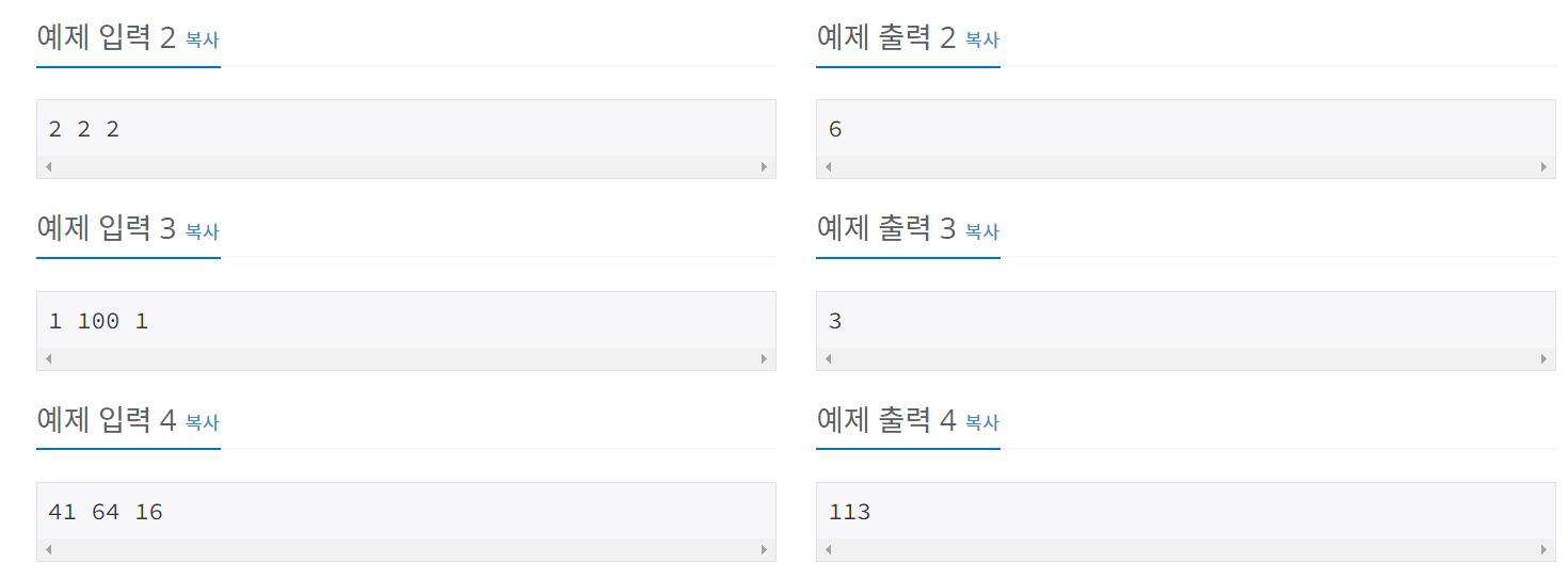 세 변의 길이를 입력받아서 가장 큰 삼각형을 만들고 그 둘레를 출력하자.