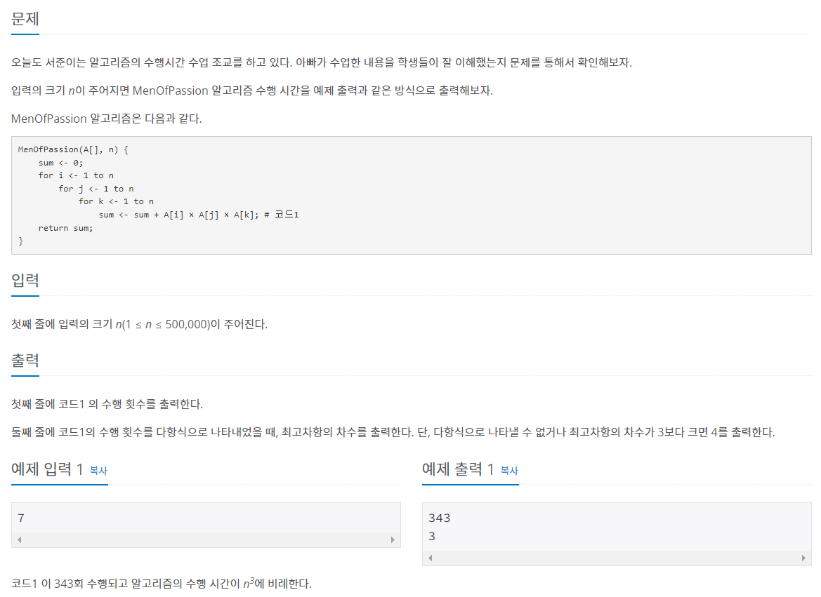 이번 문제의 알고리즘은 입력값 n 이 있을 때 수행 횟수가 n3 번이 된다.